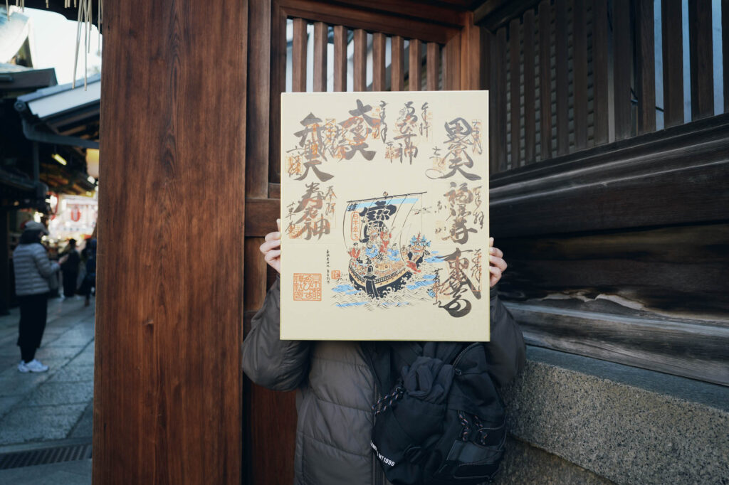 ここ京都の恵美須神社には、「日本最古 都七福神まいり」という伝統があります。府内の各神社を巡り、一つひとつ御朱印をいただくのが本来の姿ですが、こちらではすでに全ての御朱印が揃った色紙も授与されています。